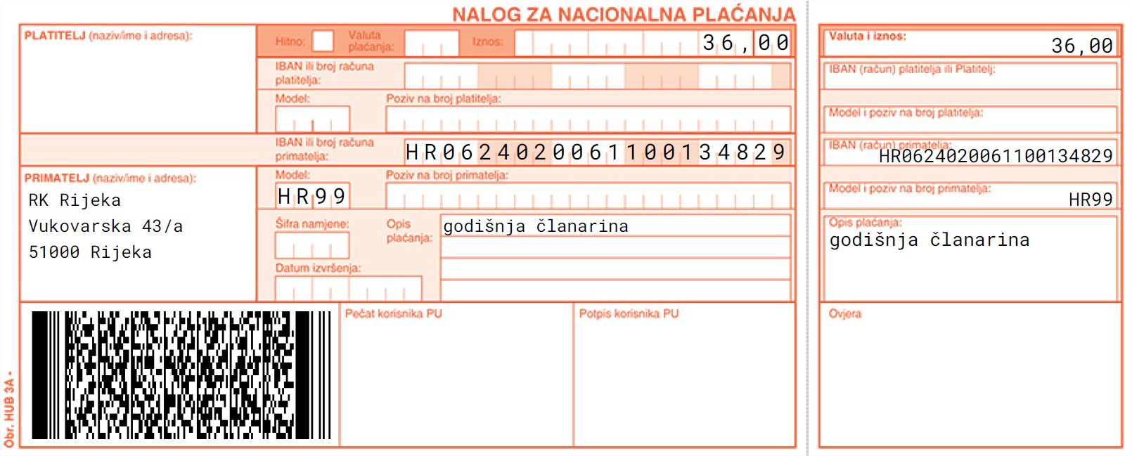 Prvo ide uplatnica za naš klub , članarina je u iznosu od 36,00 €